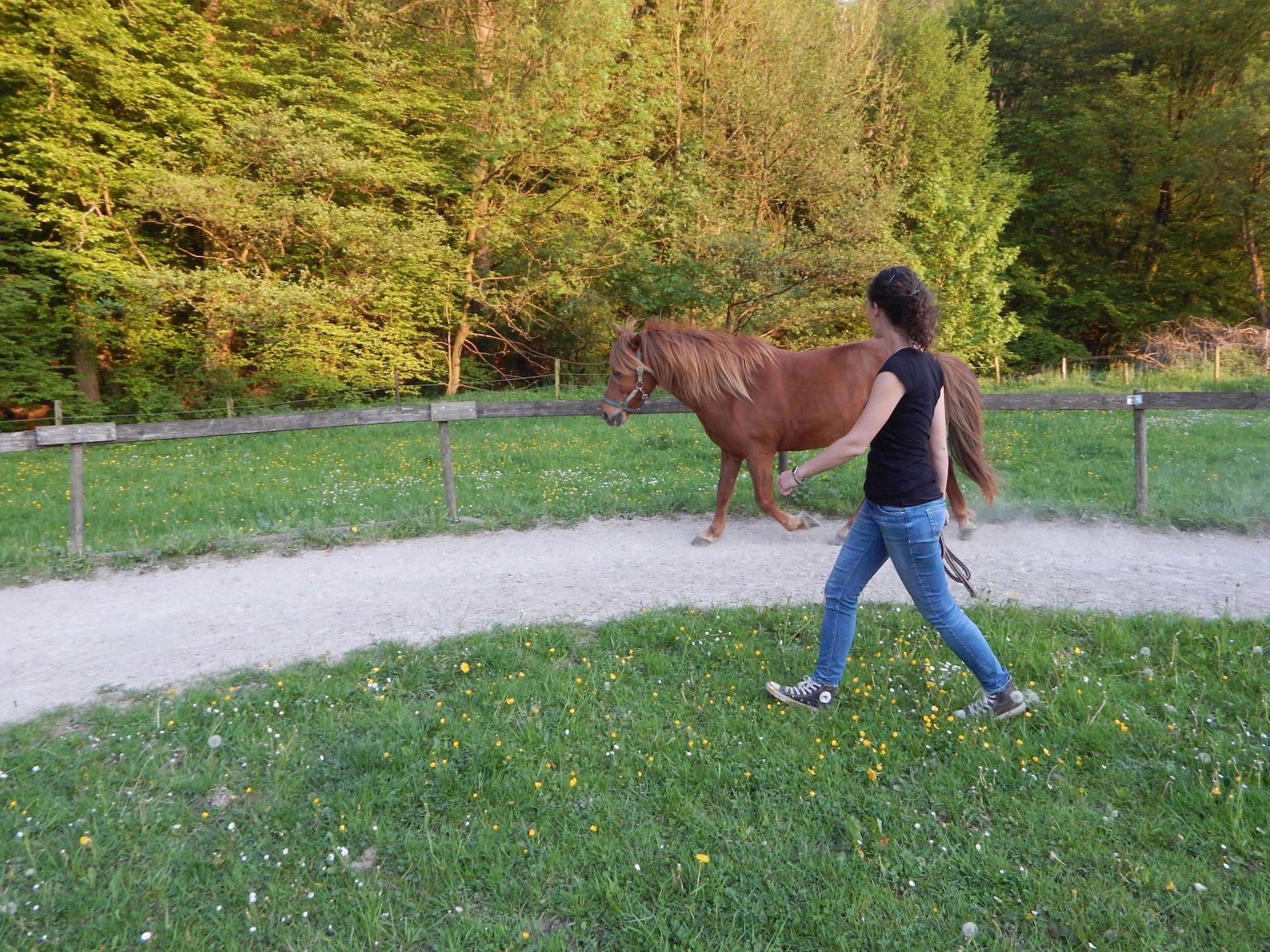 Um anschließend den Auftrag zu bearbeiten wechseln wir auf den Round Pen. Ich gebe Sara die Aufgabe, Raupe zu bewegen ohne Longe oder Führstrick. Bald hat sie es geschafft, dass Raupe Runde um Runde geht. Dabei geht sie dicht neben seinem Bauch und treibt immer mal wieder mit Stimme und Armbewegungen nach. Ich frage sie ob es nicht möglich wäre weiter zu mir in die Mitte zu kommen und Raupe trotzdem vorwärts zu schicken. Sara sagt, dass es kein Problem wäre und kommt einige Schritte in die Mitte. Raupe geht weiter. Nach einer halben Runde geht sie wieder näher dran und nimmt ihre alte Position wieder ein. Ich unterbreche die Situation und frage sie weshalb es ihr wichtig war wieder näher an das Pferd zu gehen. Verdutzt schaut Sara mich an. Dann muss sie lachen. „Genau das ist es! Es gibt keinen Grund wieder näher zu gehen. Raupe ist weder langsamer geworden, noch hat er sonst was falsch gemacht!“